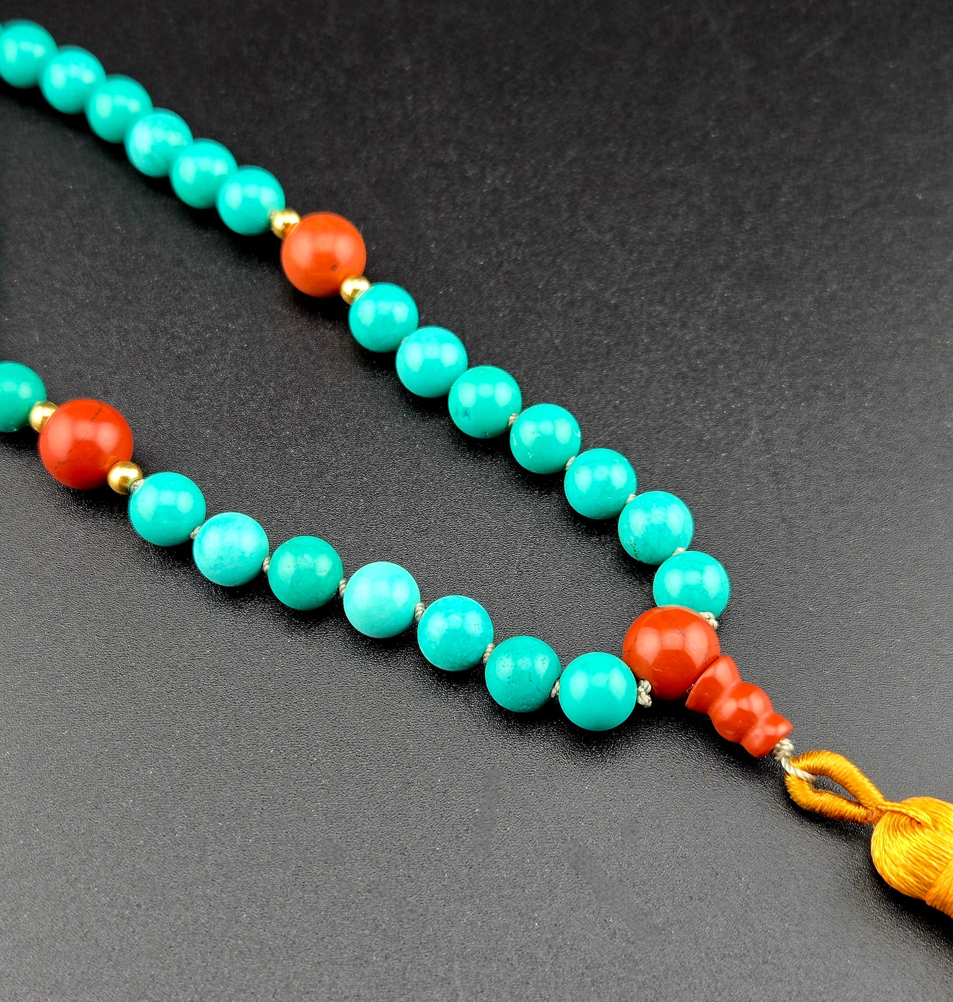 Handmade Mala Necklace. 108 Turquoise Howlite 6mm beads. (×4) 8mm Red Jasper and Guru/Tower beads. 7mm nylon thread. 18KGP Stainless accent beads. Traditional Tassel. 40" strand length. 24" total hanging length with tassel.